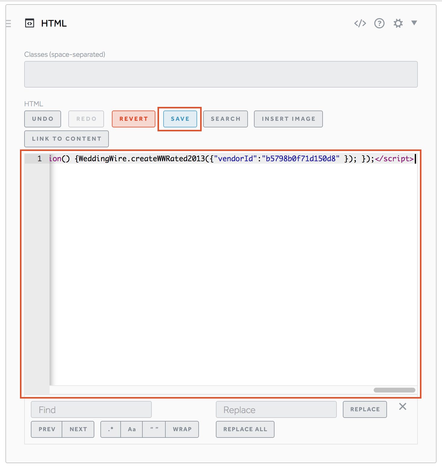 - Paste the HTML code you copied from your WeddingWire account into the HTML box. For more information on how to use this content block, click here.