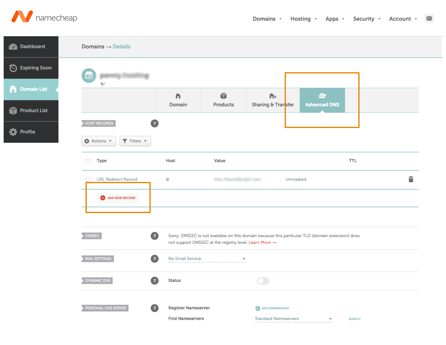 4. Select the Advanced DNS tab, and then the Add New Record button