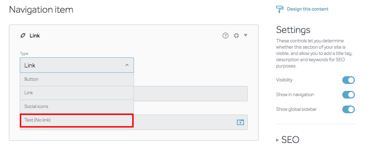 - From the drop-down, select “Text (No link). This will allow you to create a title for the portfolio/gallery without leading your viewers to a blank page. Once you have chosen this option, change the Text Label to the name you would like your drop-down menu to have.