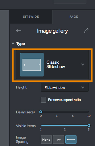 4. Under the Type section, you must 1st select the Classic Slideshow option as it is the only gallery type that includes the Visible Items feature